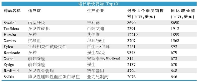 根據榜單中所列數據,這50個增長最快的藥物的絕對銷售額增加了310億美元。其中吉利德公司(Gilead)的Sovaldi以超過80億美元的銷售額增長占據榜首,其增長的銷售額占列表中所有藥物合計增長的27%。與Sovaldi、修美樂一同位于增速前列的藥物還有百健艾迪(Biogen Idec)的富馬酸二甲酯(Tecfidera)、強生和拜耳的拜瑞妥(Xarelto)及再生元(Regeneron)和拜耳(Bayer)的阿柏西普(Eylea)。
